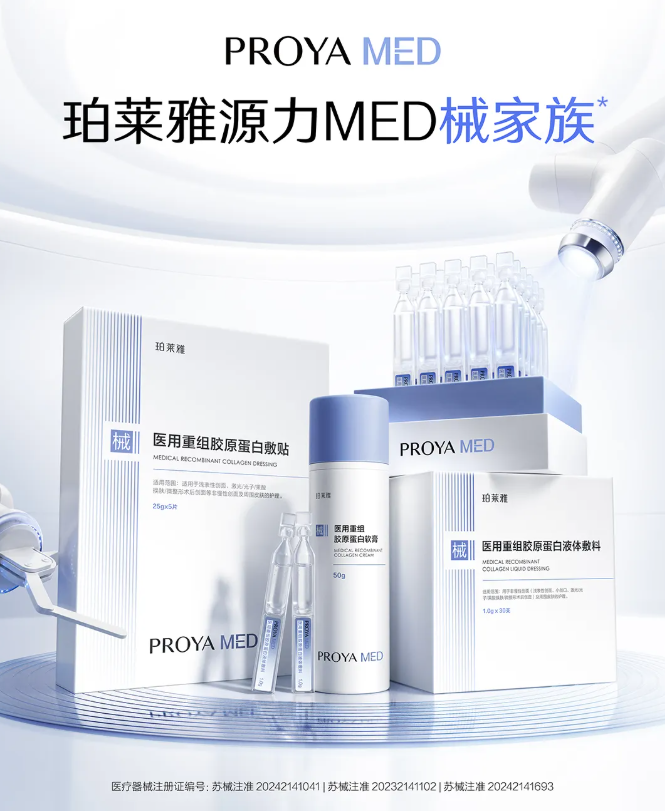 近日,珀莱雅发布「源力MED」械字号(二类)重组胶原蛋白新品,包括软膏、液体敷料、敷贴,专注术后创面护理需求。据悉,早在去年11月,珀莱雅就启用全新商标“PROYA MED”,强调医学、科学、修复;5月,珀莱雅在天猫旗舰店上架新品医用重组胶原蛋白敷贴,正式杀入“械字号”。