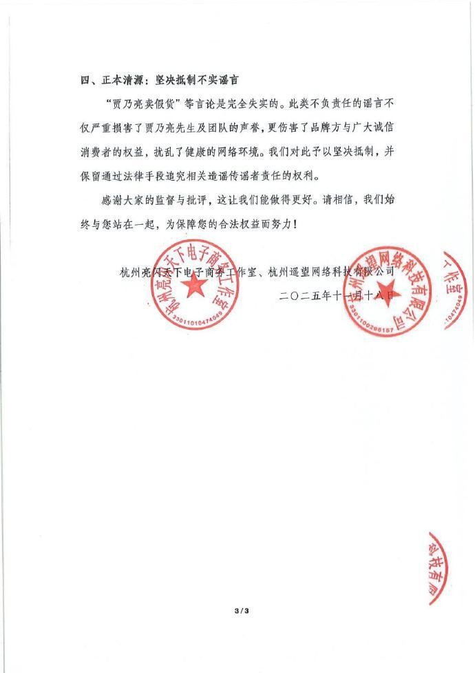 11月18日,贾乃亮工作室与其签约MCN遥望科技联合发布声明回应:经我方与抖音平台及娇兰品牌方共同确认,直播间所售卖产品均为核心官方商品,由官方旗舰店发货,物流链路由品牌官方负责,确保货源渠道统一、规范与官方正品属性。在关注到消费者反馈后,第一时间与品牌方建立高级别沟通,已主动联络消费者沟通诉求,将全力推动问题解决。