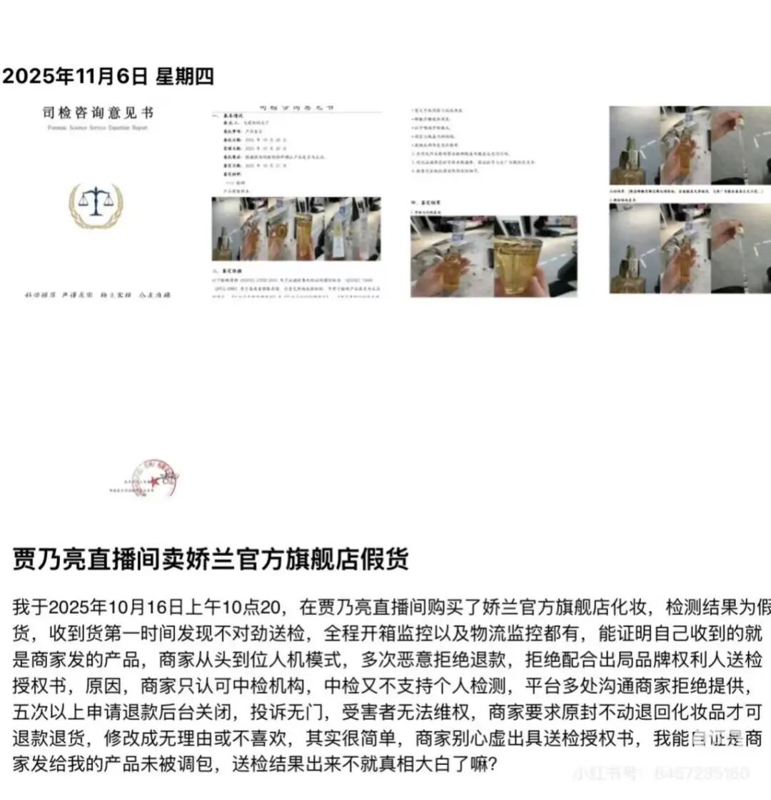 在网友@嘟嘟囔囔的自述中,其在贾乃亮直播间花费7000多元购买的娇兰化妆品,发现收到的产品与之前在专柜购买的正品在包装、质地和使用感受上截然不同,随后自费送检的第三方报告显示“综合判定为伪造产品”,但被娇兰以非中检机构为由驳回,从而陷入维权困境。
