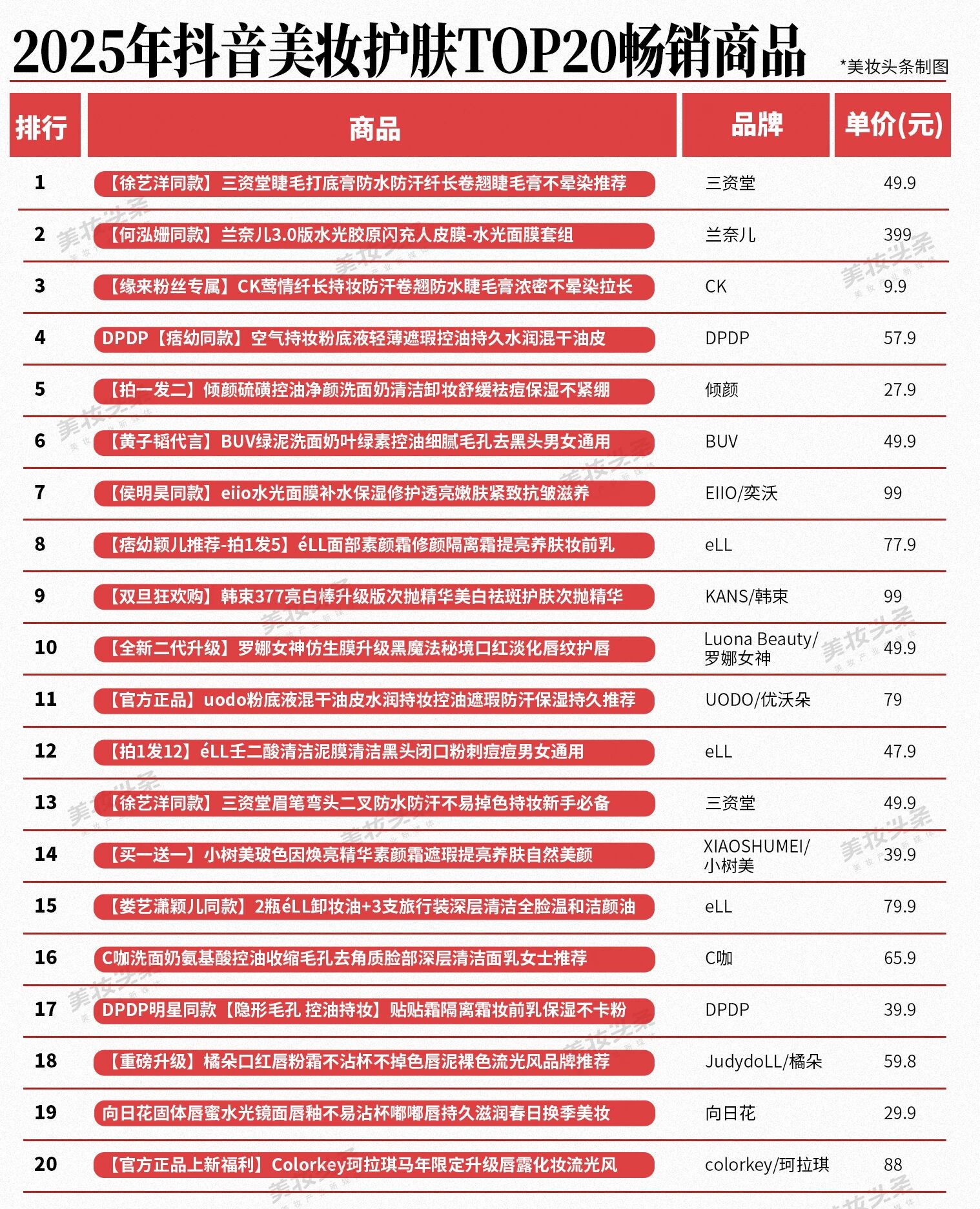 通过梳理TOP20畅销商品榜单,《美妆头条》还发现,彩妆单品占据了热榜的主导地位,护肤产品仅占据7席。此外,90%的热销商品售价集中在100元以下,涵盖粉底液、洗面奶、面膜、次抛精华、卸妆油及口红等品类。这些产品虽售价亲民,但仍精准满足消费者日常美肤需求。
