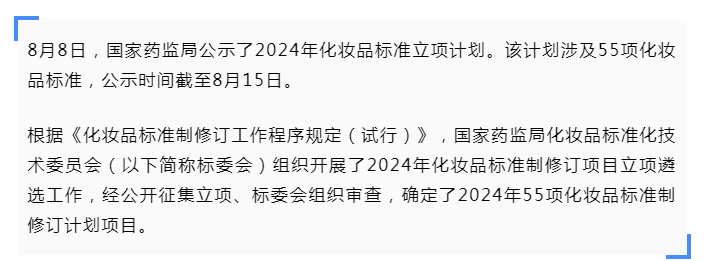 8月8日,国家药监局公示了2024年化妆品标准立项计划。该计划涉及55项化妆品标准,公示时间截至8月15日。