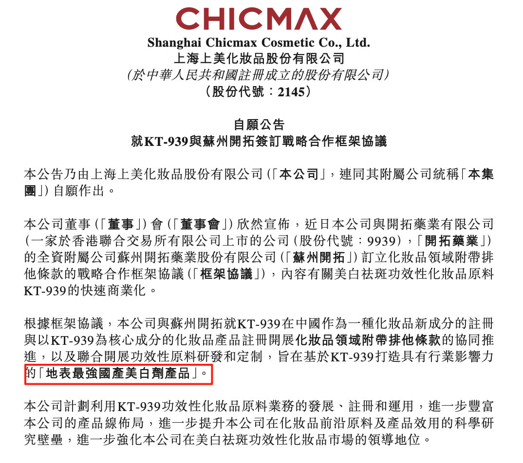昨日(3月17日),上海上美化妆品股份有限公司(简称“上美股份”)发布公告,宣布与开拓药业有限公司全资附属公司苏州开拓药业股份有限公司签署战略合作框架协议。双方将围绕具备美白祛斑功效的化妆品原料KT-939,开展具有排他性条款的商业化合作,目标将其打造为具有行业影响力的“地表最强国产美白剂”。