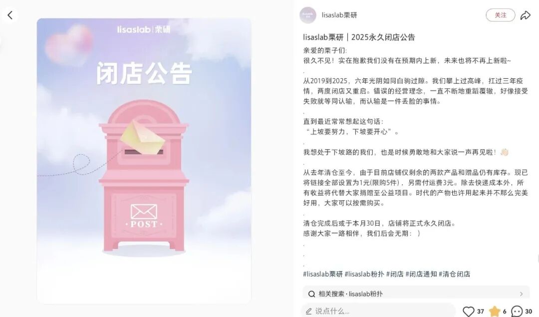 近日,美妆工具品牌lisaslab栗研发布2025永久闭店公告称,清仓完成后或于11月30日,店铺将正式永久闭店。据悉,该店铺自2024年开始清仓,目前除去快递成本外,所有收益将代替购买者捐赠至公益项目。据悉,lisaslab栗研成立于2019年,曾攀上过高峰,扛过三年疫情,两度闭店又重启。