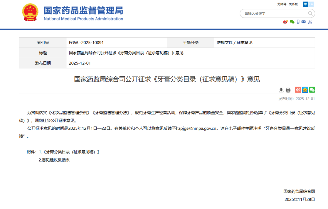 近日,国家药监局发布《牙膏分类目录(征求意见稿)》,公开征求意见至2025年12月22日。《征求意见稿》提出,牙膏备案人在进行牙膏备案时,应当根据牙膏功效类别和使用人群,按照本目录的规则填报产品分类编码,每一类别的牙膏不得超出其对应的功效机理。