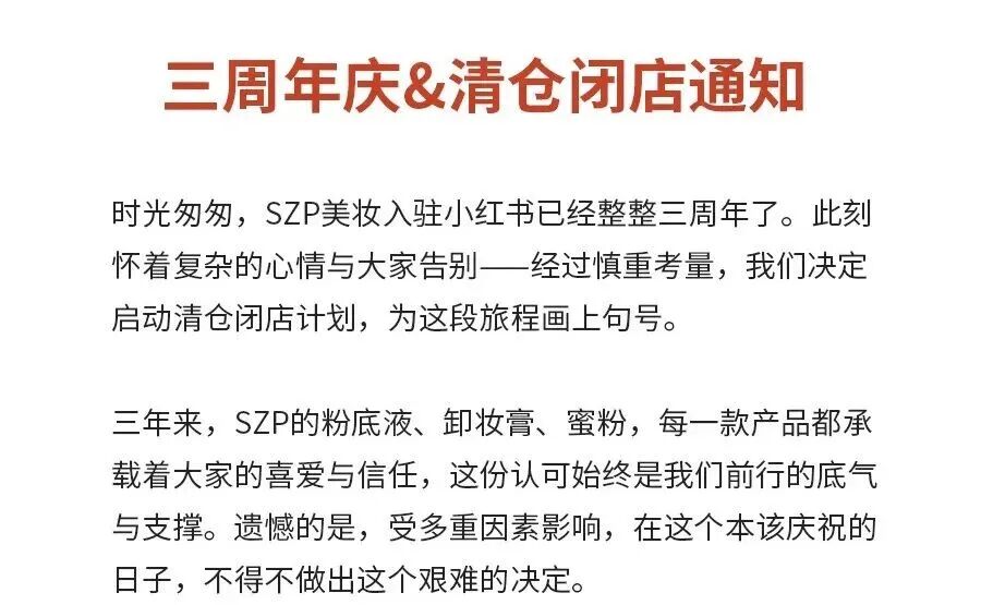 就在12月2日,国货彩妆品牌SZP在小红书发布通知,宣布全店清仓并结束运营,理由是“产品成本高、售价低、广告投放费用上涨,整体无法覆盖成本”。