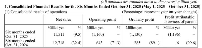 近日,雅萌发布2025财年第二季度财报(截至2025年5月1日-10月31日),财报显示,公司净销售额为115.11亿日元(约合人民币5.19亿元),同比下滑9.5%;营业利润、普通利润以及归母净利润均由盈转亏,亏损均超11亿日元(约合人民币近5000万元)。