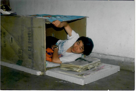 冰寒老师备考大学时为彻夜复习,借用老师的办公室晚上睡在冰箱包装箱内,考上后特意留影 | 图源:冰寒老师知乎账号,摄于1997年春