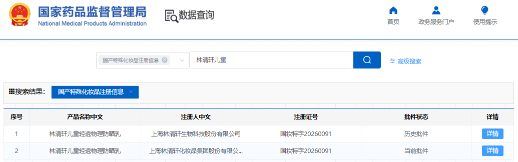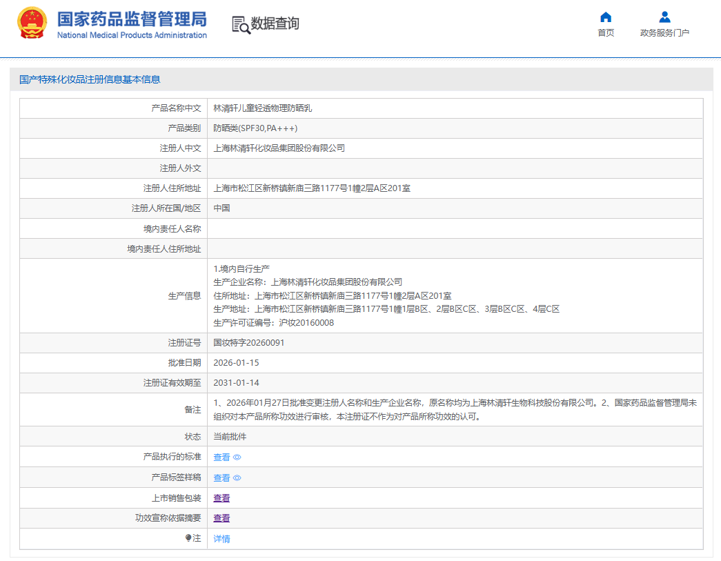 国家药品监督管理局国产特殊化妆品注册信息基本信息显示,上海林清轩化妆品集团股份有限公司正式注册首款儿童防晒产品“林清轩儿童轻透物理防晒乳(国妆特字20260091)”,携品牌核心山茶花成分入局,完成了从成人高端护肤到儿童防晒领域的关键跨界。