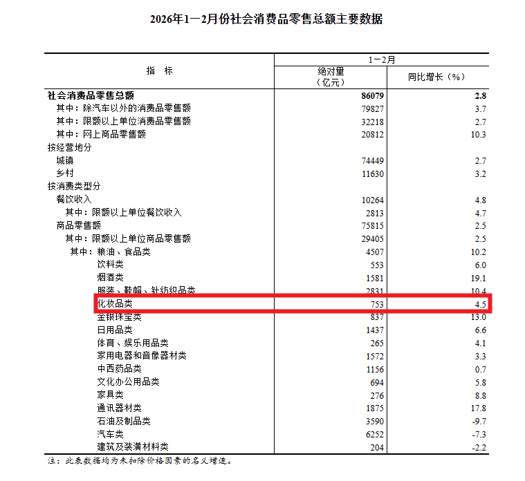 国家统计局数据显示,2026年1—2月化妆品类零售总额达753亿元,同比上涨4.5%,增速高于社会消费品零售总额2.8%,展现出强劲的消费韧性。