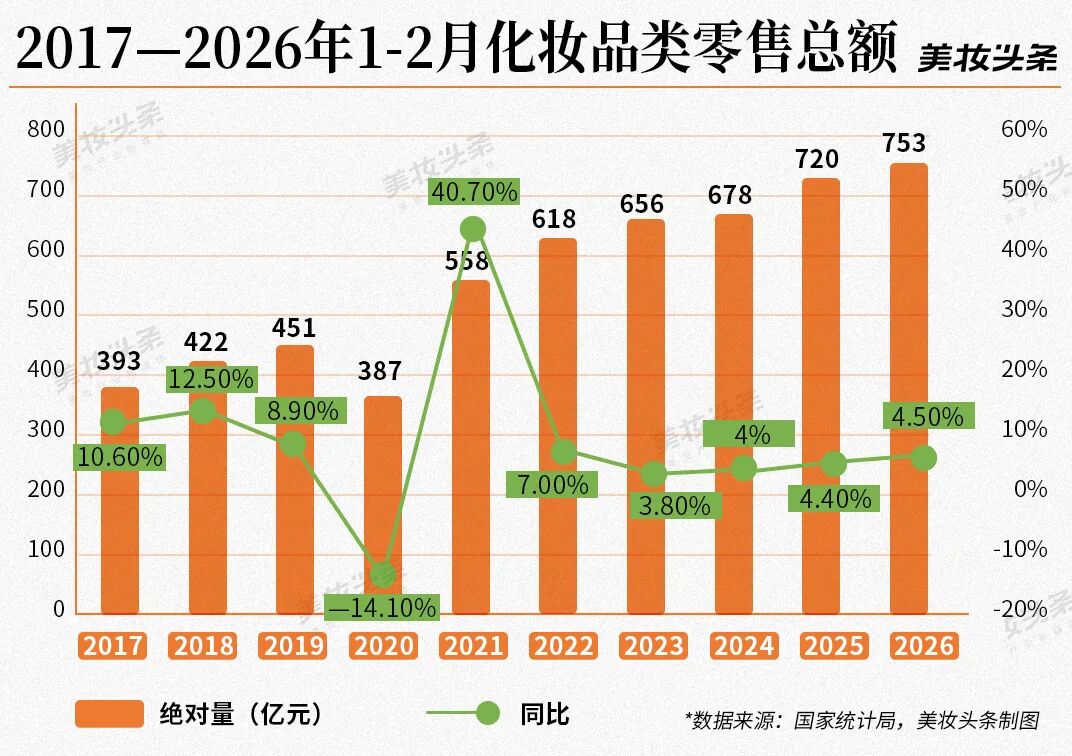 753亿元、同比增长4.5%,这是2026年开年化妆品市场上交的“成绩单”。