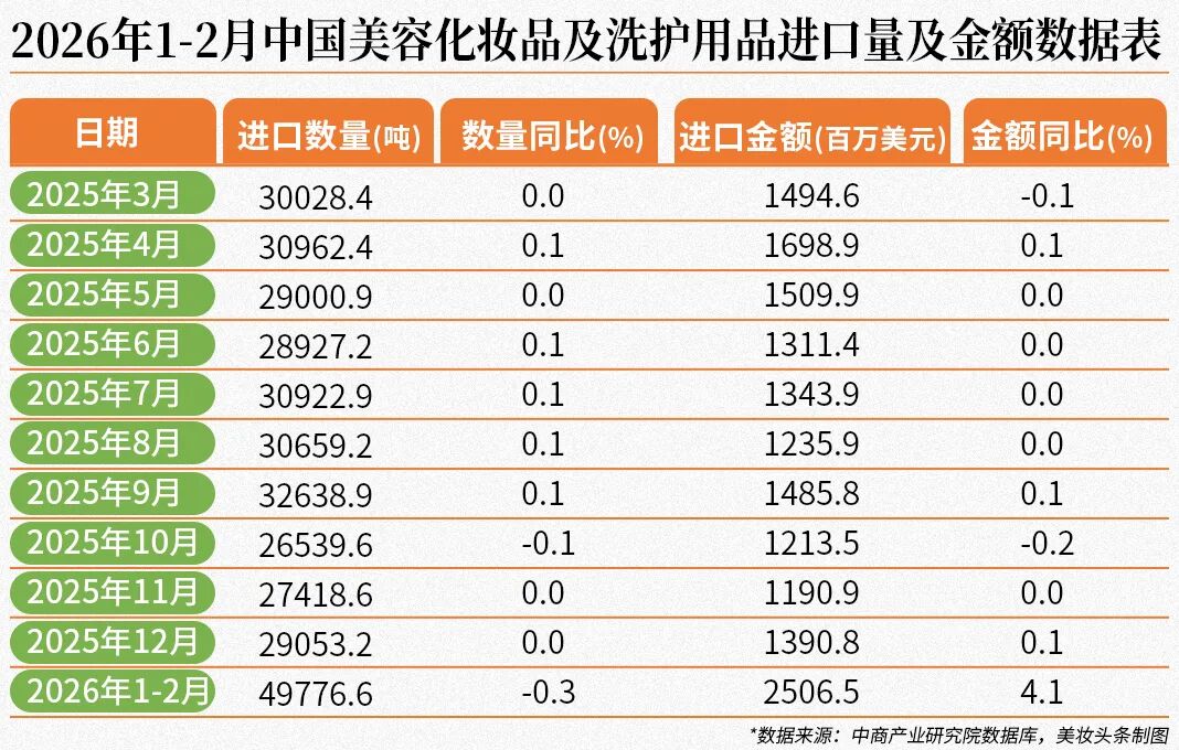 从金额方面来看,2026年1-2月中国美容化妆品及洗护用品进口金额2506.5百万美元,同比增长4.1%。