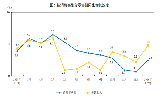 近日,国家统计局发布2026年1—2月社会消费品零售总额主要数据。数据显示,1—2月份,社会消费品零售总额86079亿元,同比增长2.8%。