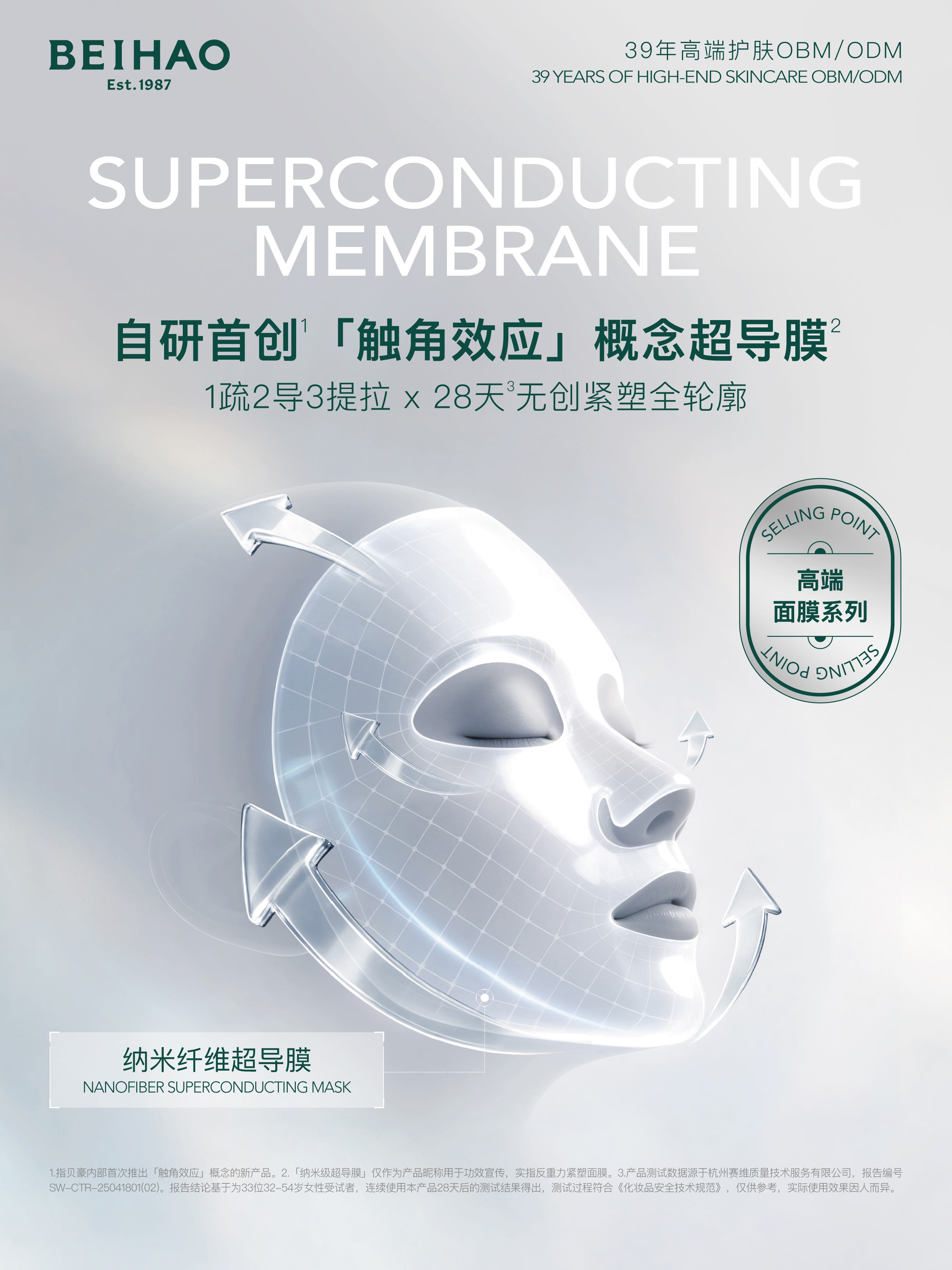 事实上,贝豪早在2020年推出的铂金面膜,便突破膜布仅为载体的认知,引领功效性膜布;2023年推出的7A铂可拉面膜,实现膜材安全与功效双突破;今年展会上,纳米纤维超导膜再次将功效维度拓宽。