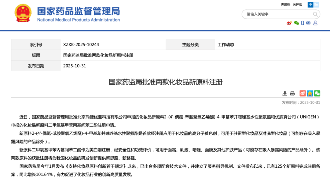 近日,国家药品监督管理局批准北京尚捷优蓝科技有限公司申报的化妆品新原料2-(4'-偶氮-苯胺聚氧乙烯醚)-4-甲基苯并噻唑基水性聚氨酯和优旎真公司(UNiGEN)申报的化妆品新原料二甲氧基甲苯丙基间苯二酚注册申请。