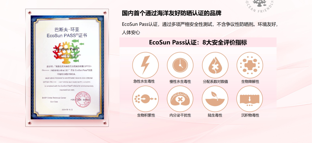 为落实生态环境保护、可持续发展目标,美肤宝品牌联合巴斯夫共同完成美肤宝蔚蓝大伞防晒的研发,实现无奥克立林、二苯酮-3、4-MBC等海洋环保禁令成分,打造出了产品独一无二的环保价值,在确保防晒效果的同时,大幅减少了对环境的污染和生态环境的影响,是国内首款符合BASF EcoSun Pass标准的生态友好及海洋友好型防晒产品。