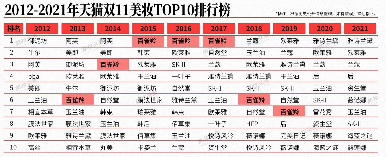 百雀羚登顶抖音美妆护肤品牌榜,成为今年双11战线中首个重大变化。