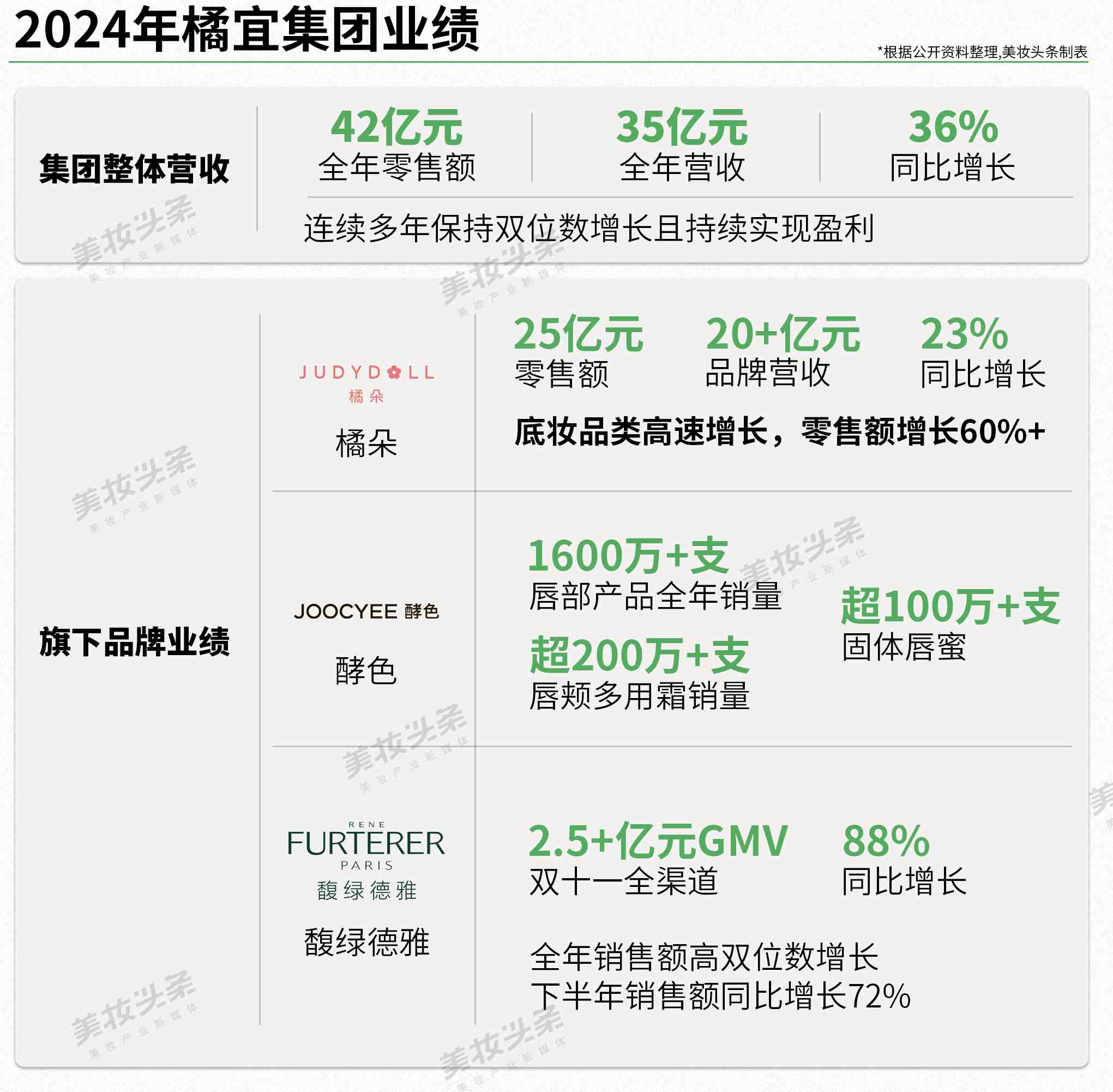以橘朵、酵色两大彩妆品牌起家的橘宜集团,近年来则通过收购馥绿德雅、丰添切入高端护发赛道,并拓展百植萃布局功效护肤,逐步完成从“平价彩妆”到功效护肤、高端洗护品类的跨越,且业绩已全面开花。