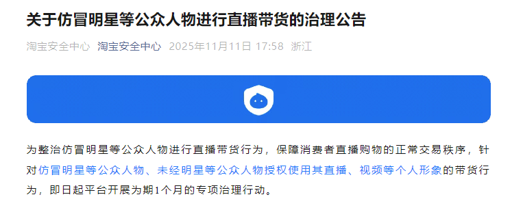 而在“双十一”大战即将落幕时,淘宝安全中心再发布《关于仿冒明星等公众人物进行直播带货的治理公告》,声称将在11月11日起针对仿冒明星等公众人物、未经明星等公众人物授权使用其直播、视频等个人形象的带货行为,开展为期1个月的专项治理行动。