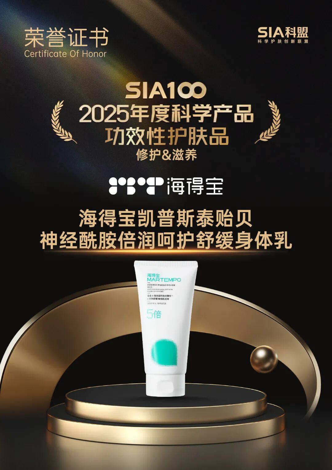 刚刚落幕的SIA2025科学护肤创新联盟年度大会上,海得宝MARTEMPO旗下核心产品——海得宝MARTEMPO凯普斯泰贻贝神经酰胺倍润呵护舒缓身体乳(简称:5X大白管特护霜)与海得宝MARTEMPO凯普斯泰贻贝丰润呵护唇膏(简称:20X唇敏修护唇膏),成功入选权威的“SIA100科创护肤影响力盛典”,并荣获“科学产品-功效性护肤品”奖项。