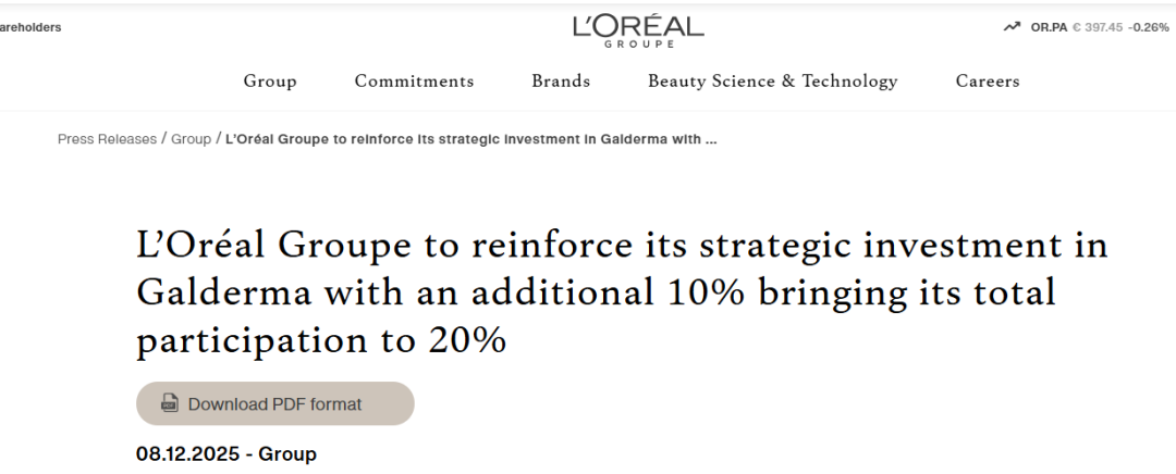 在财报中,欧莱雅重点提及了在护肤领域的另一项重要布局——增持瑞士皮肤科学美容集团高德美(Galderma)的股份至20%。