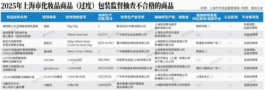 近期,上海市市场监督管理局发布《2025 年上海市化妆品商品包装物减量(过度包装)监督抽查结果》。在抽查的150批次产品中,多批次产品因包装问题不合格,涉及国际品牌、本土老牌以及近年势头强劲的新锐品牌。